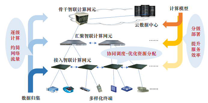 智联计算网络的核心架构,是扩展网络的能力维度,增加计算、存储和智慧能力空间,实现网络计算存储协同处理,将信息网络发展成为提供“算 ‒ 网 ‒ 数”多元网络服务的新型信息基础设施,成为“人 ‒ 机 ‒ 物”泛在互联赋能平台。智联计算网络面向数据产生和使用最多的网络边缘,在现有网络已完成缓存下沉的基础上,进一步把计算下沉到接入汇聚节点,协同调度各种计算、传输和存储资源,实现应用驱动部署分级计算模型、计算任务调度数据归集传送以及数据在网络中的高效计算或处理。