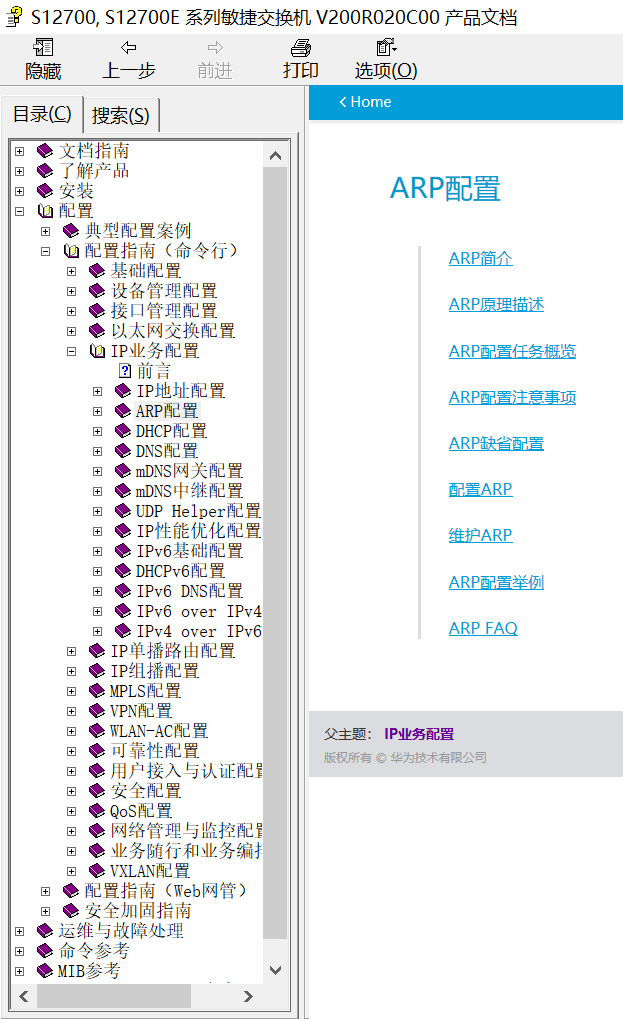 在网络设备的实际使用过程中,对某些技术原理不清楚,或者对命令不太熟悉时,可以使用官方的产品文档,产品文档包括产品介绍、安装、配置、运维与故障处理、命令参考、MIB 参考 、API 参考等内容。只要有一哈密招投标网点网络基础,就可以拿着产品手册解决绝大部分的网络问题。以 S12700 系列交换机为例,查找 ARP 相关内容,结果如下图。