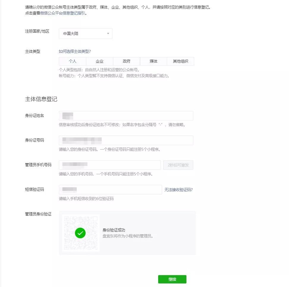 (1)我们一般都是选择个人的,其它的需要证件。输入好信息,记得先使用微信扫一扫绑定你的微信,才可以点击【继续】