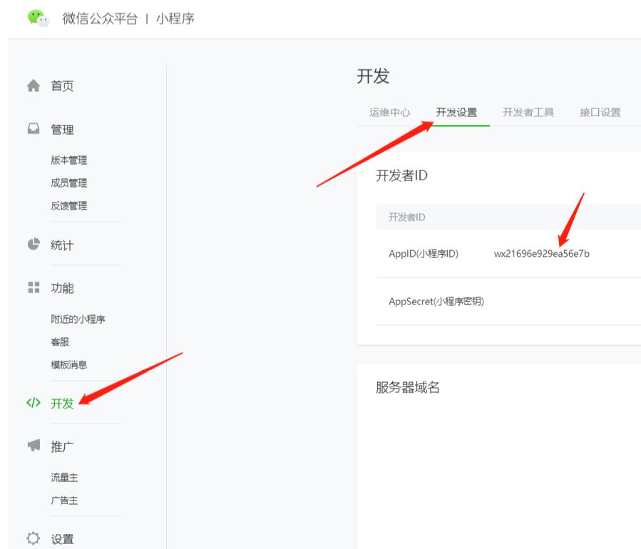 (7)设置你的小程序项目信息。AppID登录你的小程序获取。在【开发】——>【开发设置】