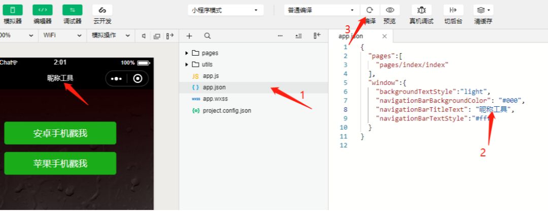 (1)上述步骤把代码导入进来以后,修改一下小程序名称,然后编译一下看看效果。