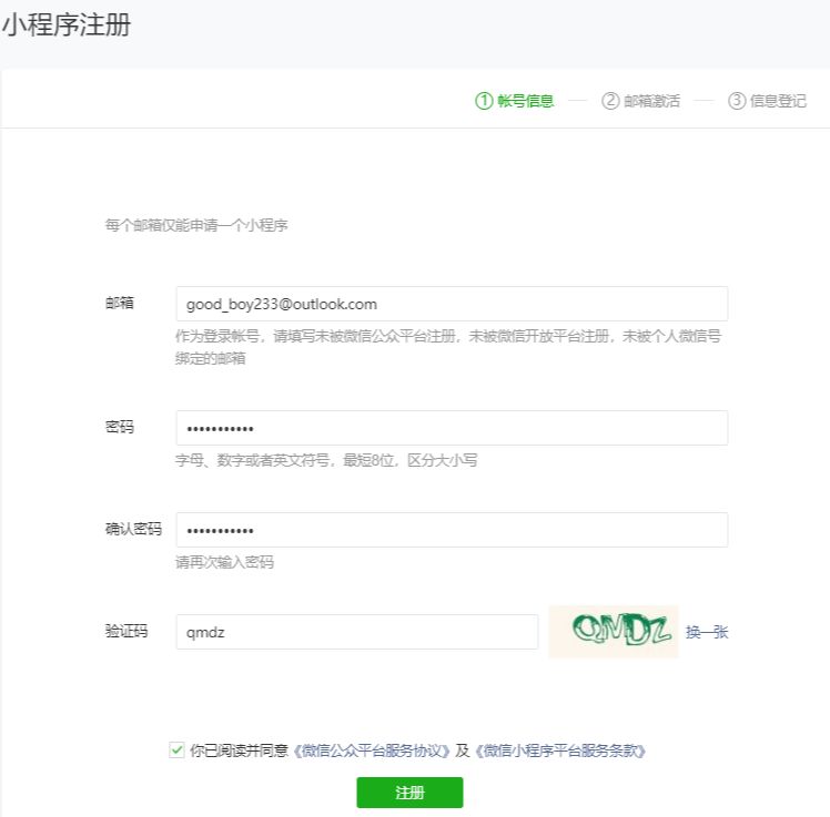 第一步:申请小程序账号